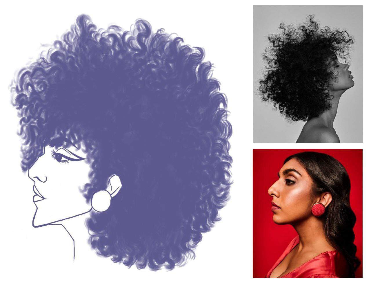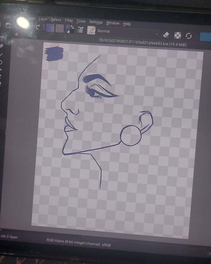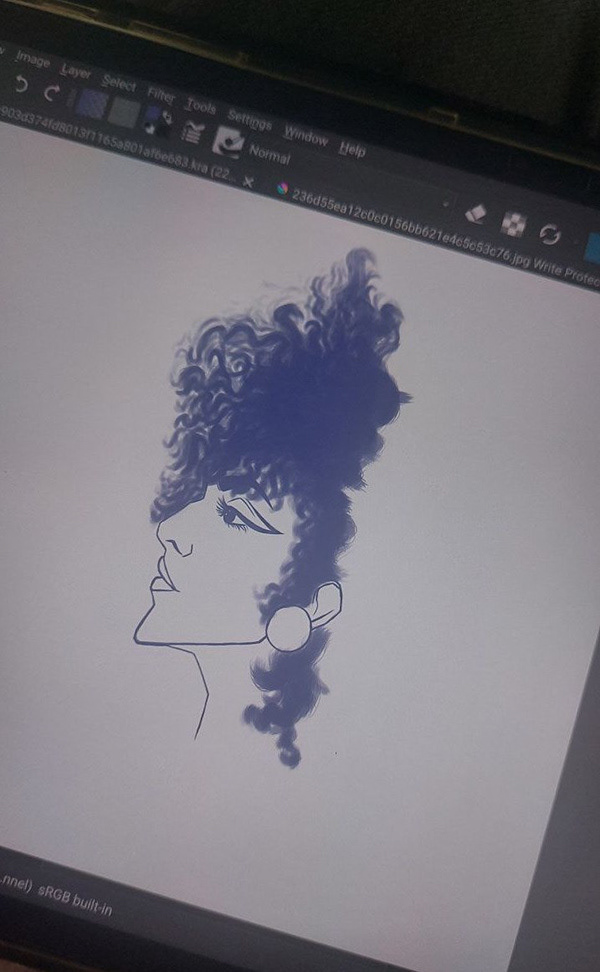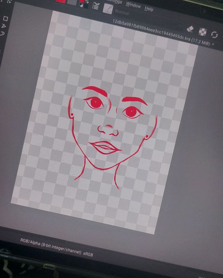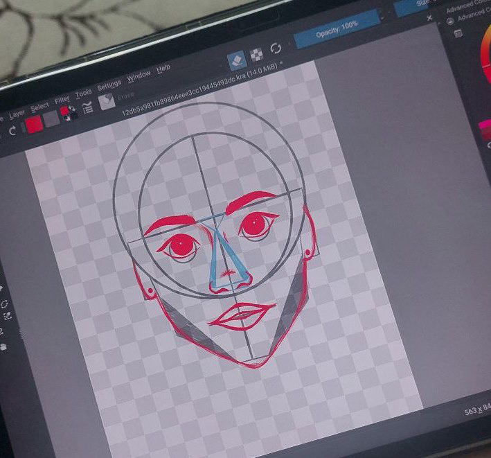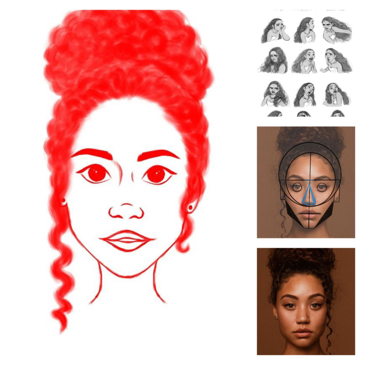Krita sketches exploring facial proportions and expression by blending features from various references to create a unique, stylized character.
